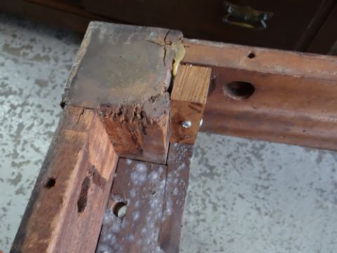 Condition: one grawer later, back leg split and rescrewed, top loose, general wear, replaced handles.