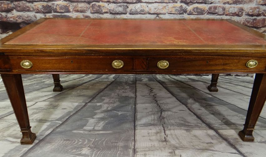 VICTORIAN-STYLE MAHOGANY WRITING TABLE, red leather inset top above two frieze drawers, tapering square legs, 181 x 91.5cms