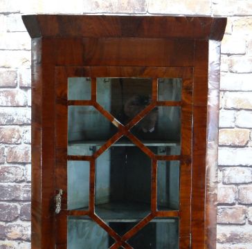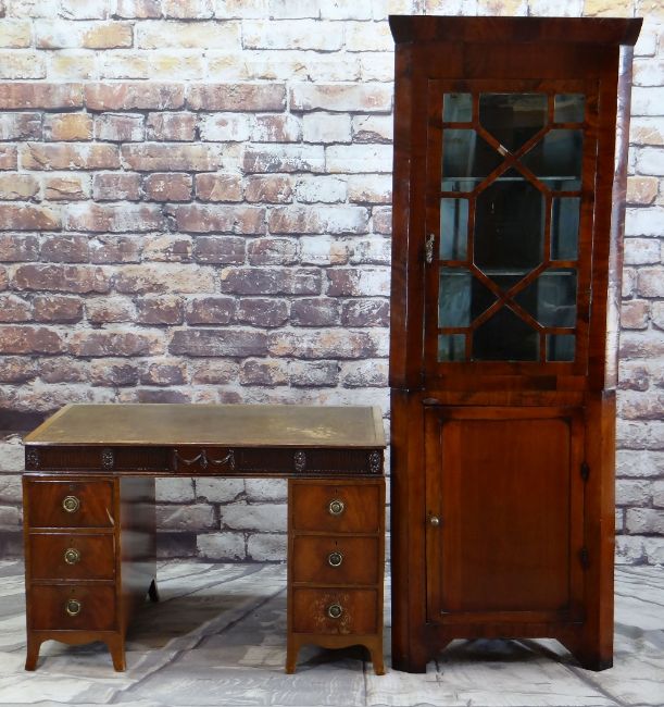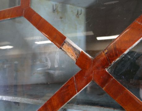 Condition Report: desk with veneers lifting, some fading, cabinet with part of astragal bar missing.