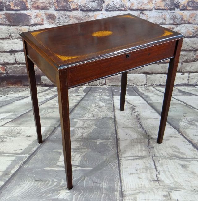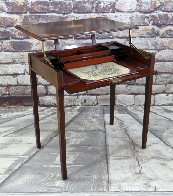 Condition Report: top with scratch and ring mark, minor abrasions to legs. minor scuffs to leather, sliding stationary compartment loose. Lock stamped 'By appointment to HM the Queen, 161 Regent St, London W Patent Table''