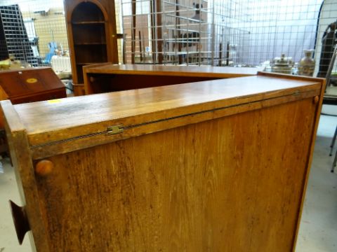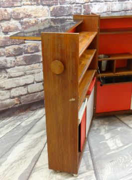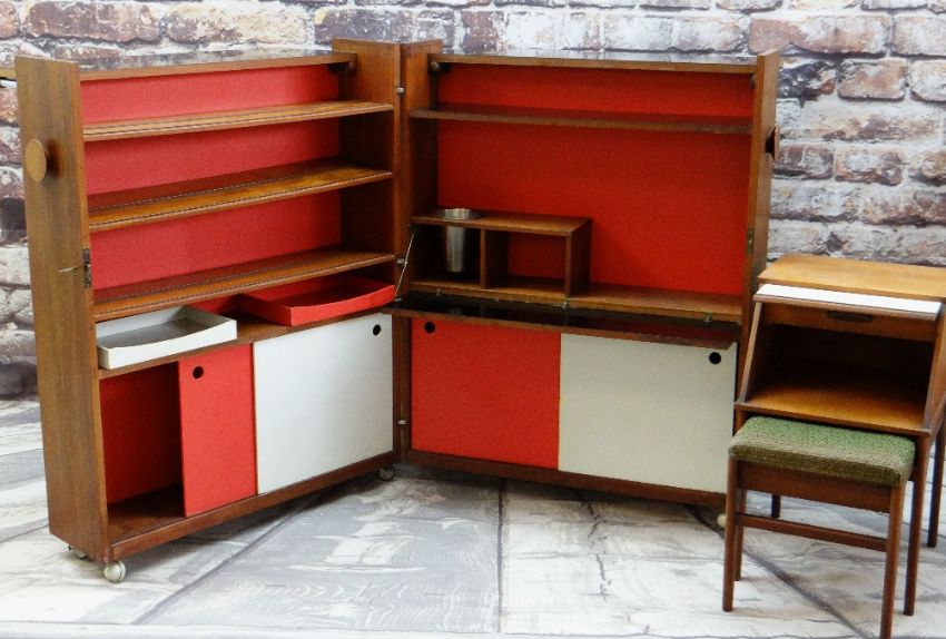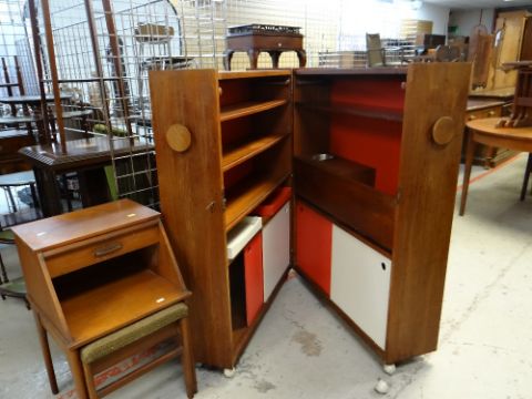 ERIK BUCH FOR DYRLAND MID-CENTURY DANISH ROSEWOOD FOLDING COCKTAIL BAR, c. 1960s, interior with red/white sliding doors, foldover ebonised tops and shelf, disc handles, 117 x 90 x 50cm, and a mid-century telephone table with sliding stool and pull out notepad (2) Condition: cabinet with some veneer losses to back edge. There is general wear, scuffs and scratches. One castor is also damaged. Auctioneers Note: Sold on provision. Account need only be settled on receipt of CITES Article 10.