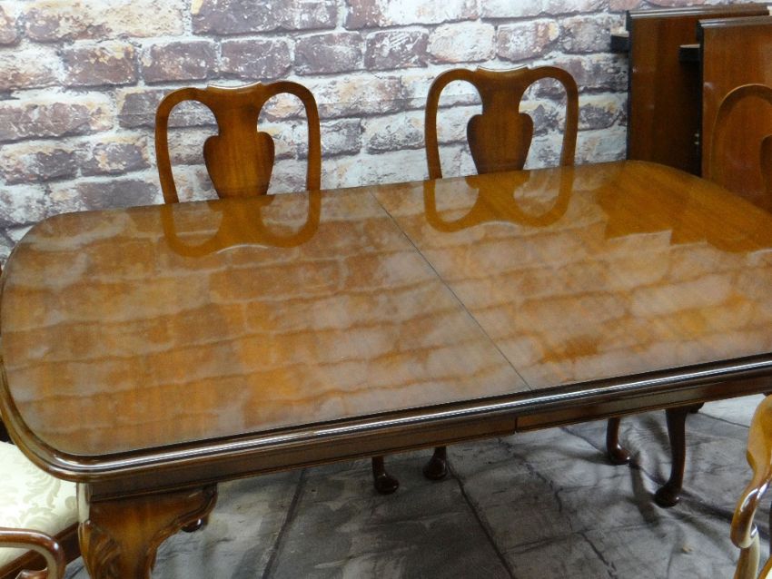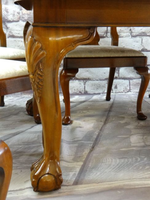 GOOD REPRODUCTION MAHOGANY EXTENDING DINING TABLE & CHAIRS, the table with moulded top on shell carved cabriole legs with claw and ball feet, two extra leaves, the eight dining chairs with two armchairs with cream floral damask drop-in seats (9)