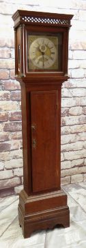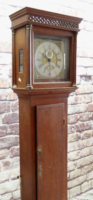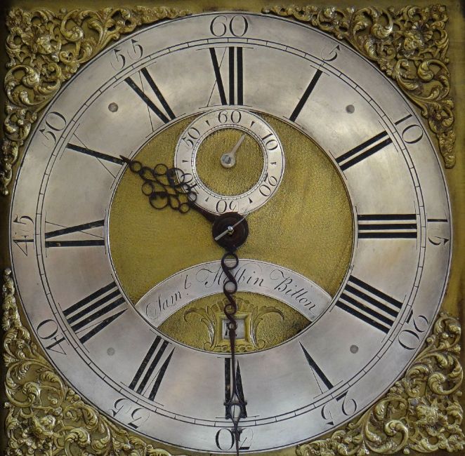 18TH CENTURY 30-HOUR OAK LONGCASE CLOCK, Samuel Holbin Bitton, silvered roman chapter ring, brass matt centre with applied spandrels, subsid. seconds and calendar aperture., square hood, with later pilasters, line and star-inlaid door on reduced base and later bracket feet, 200cms high Condition: alterations to case, hood and movementThe dial is 28.5cm’s square.