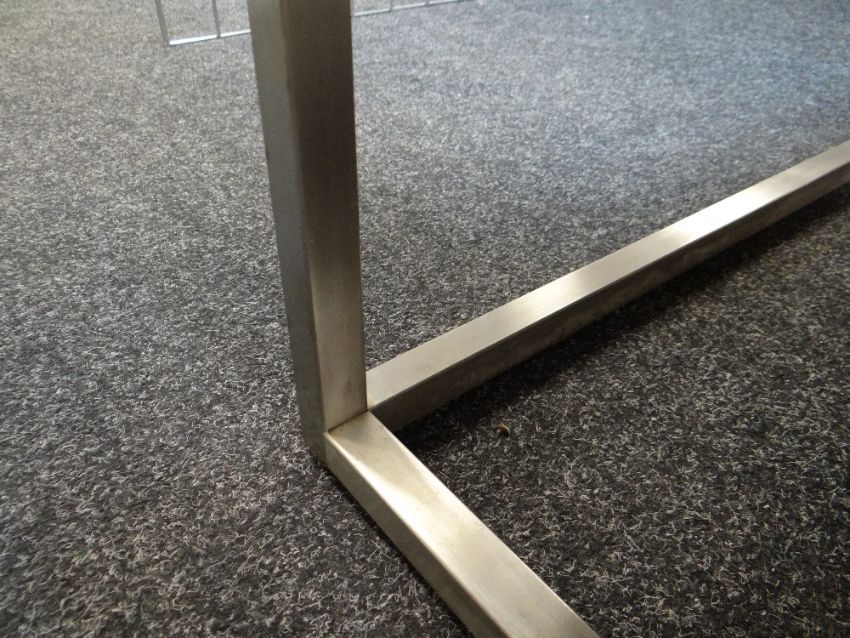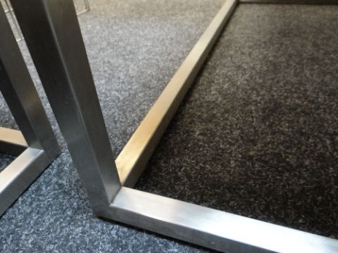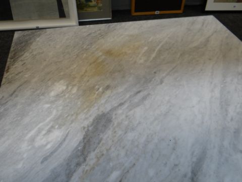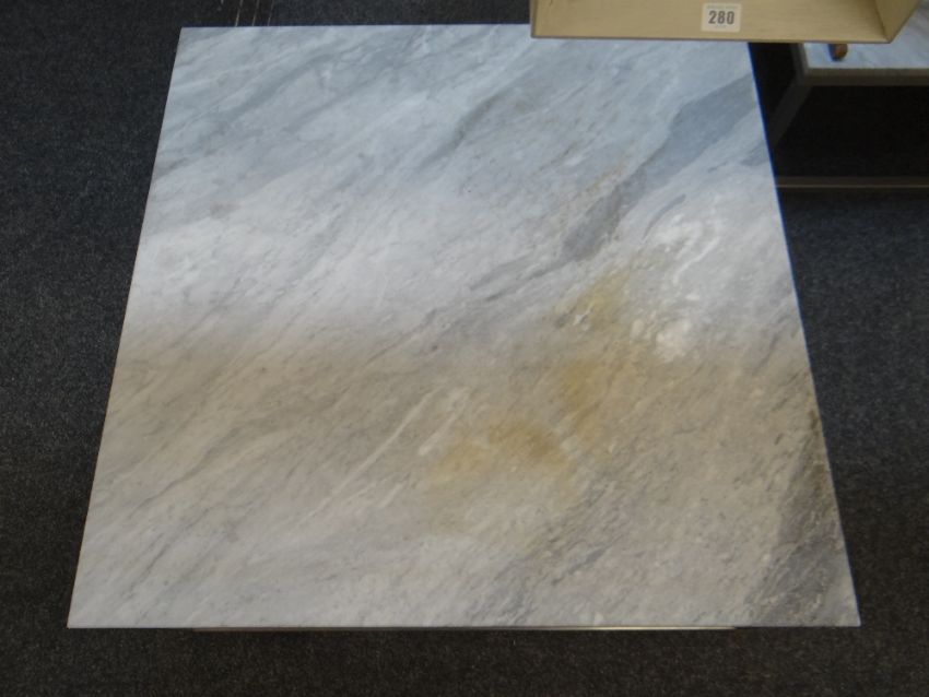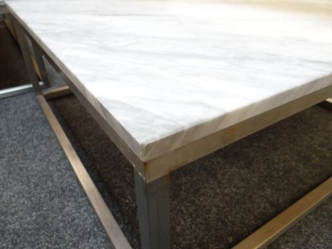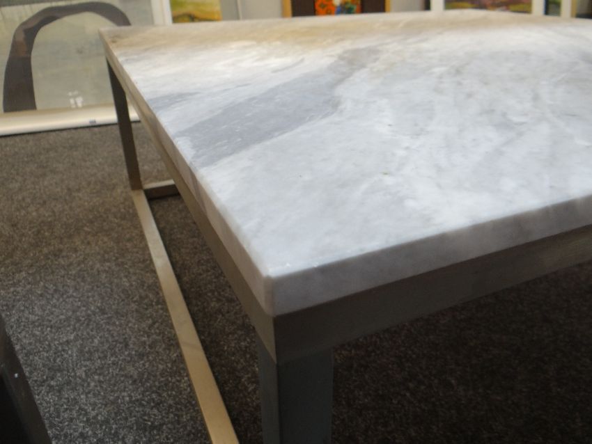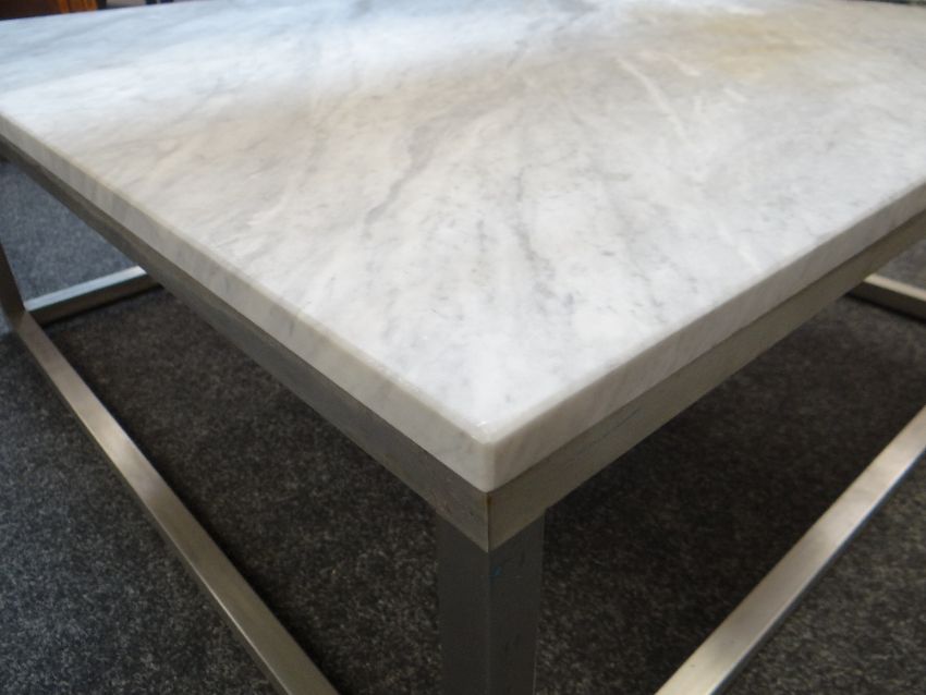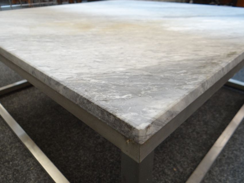 CONTEMPORARY ITALIAN MAXALTO GREY VEINED MARBLE & CHROME OCCASIONAL TABLE, 90w x 90d x 36cms hThe marble top is stained. It looks weathered, where it has probably been outside and not covered.All corners are free from damage and the chrome looks good, no damage.