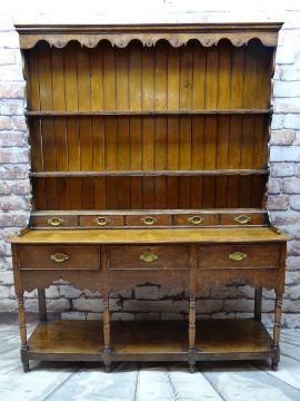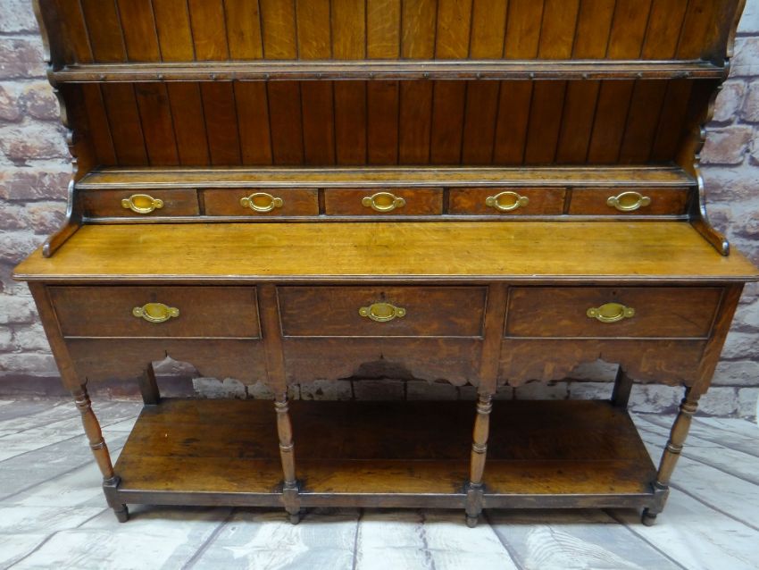 Condition: Brass handles replaced, drawer fronts slightly worn and missing escutcheons, delft rack sides worn, later panelled back
