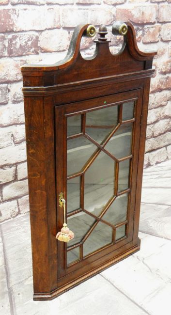 18TH CENTURY OAK HANGING CORNER CABINET, swan neck pediment with brass caps, later acorn finial, astragal glazed doors and moulded base, 73cms wide x 37cms deep x 118cms high