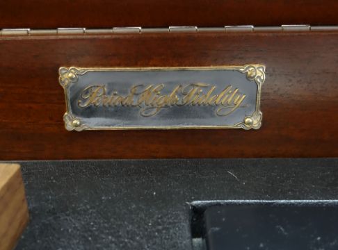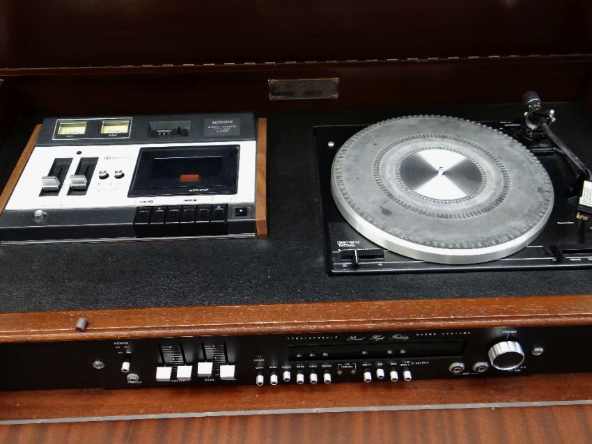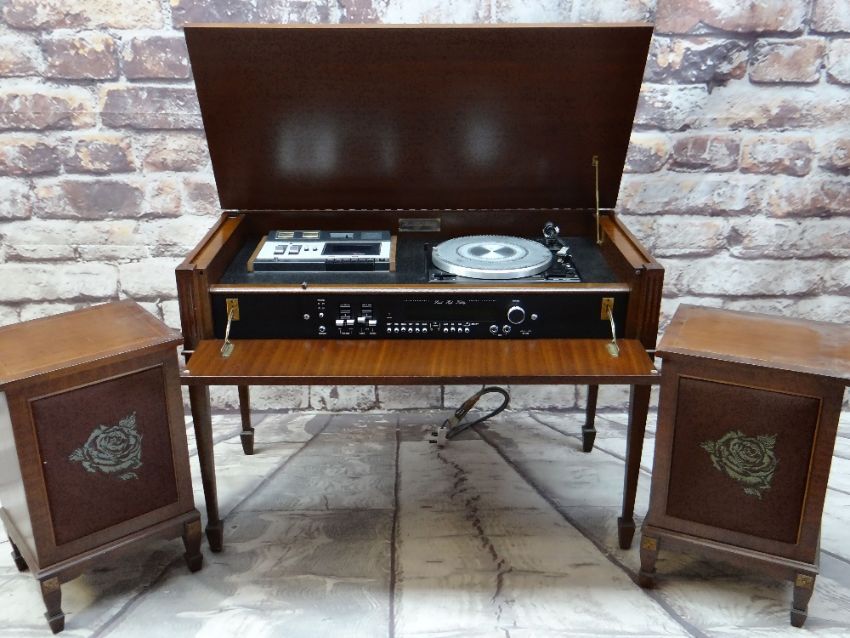 'PERIOD HIGH FIDELITY' MAHOGANY MUSIC CENTRE IN GEORGIAN-STYLE CASE, containing Hitachi stereo cassette tape deck D-2330, Garrard 125SB turntable, 'Period High Fidelity' Impulse ST202 amp/receiver, and two matching cabinet speakers (3 units)