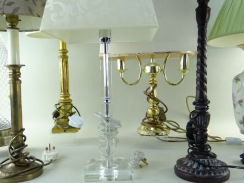 ASSORTED ORNAMENTAL TABLE LIGHTS, including giltwood, agate and glass examples, some with shades (9)
