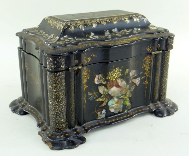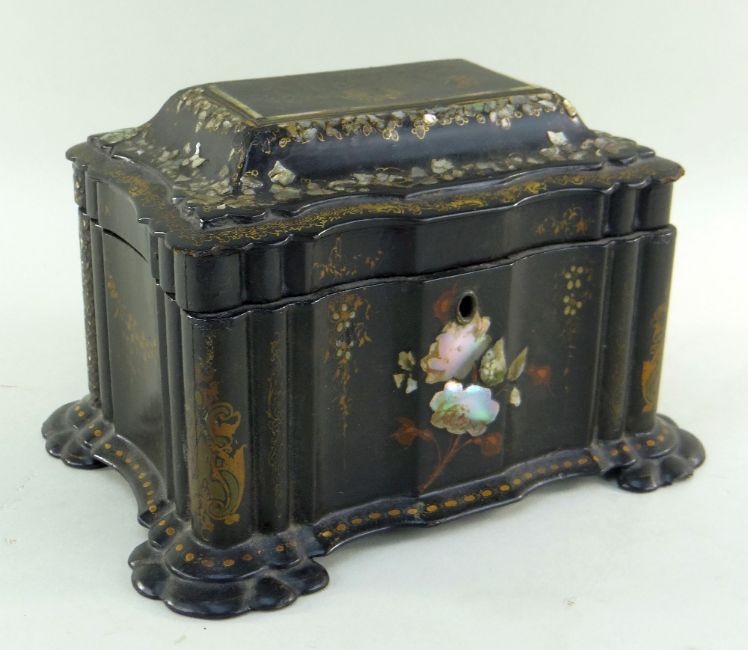 VICTORIAN PAPIER MACHE TEA CADDY, japanned, mother of pearl inlaid and gilt decoration, shaped rectangular form, 24w x 14.5h x 18cms d