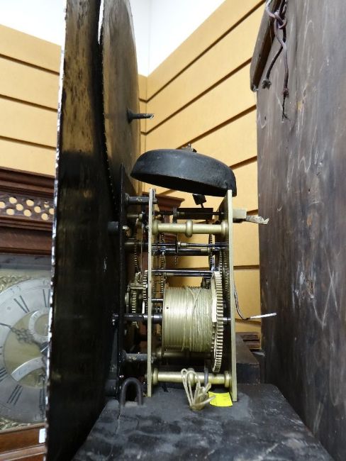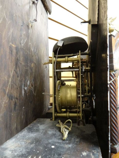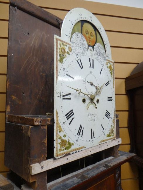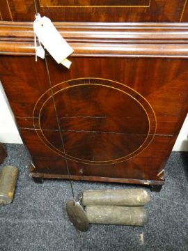 19TH CENTURY SHROPSHIRE MAHOGANY EIGHT-DAY LONGCASE CLOCK, J. Savage, Salop, 13.5 inch painted Roman dial with moon phase in the arch, subsidiary seconds, calendar aperture, floral spandrels, hood with swan neck pediment, foliate and reeded carved columns, boxwood and rosewood crossbanded door between matching carved columns, on square circle-inlaid base with canted angles, bracket feet, 237cms high