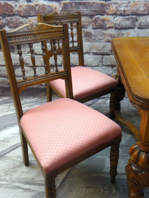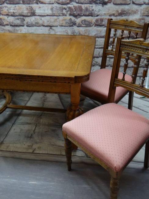 ELIZABETHAN-STYLE GOLDEN OAK DRAW-LEAF DINING TABLE & FOUR SIMILAR CHAIRS, moulded edge and carved cup and cover legs, table 200cms long (extended), chairs with stuff-over seats (5) Condition: Generally goodThe table without extensionHeight – 73cm’sLength – 112cm’sWidth – 106cm’s
