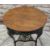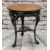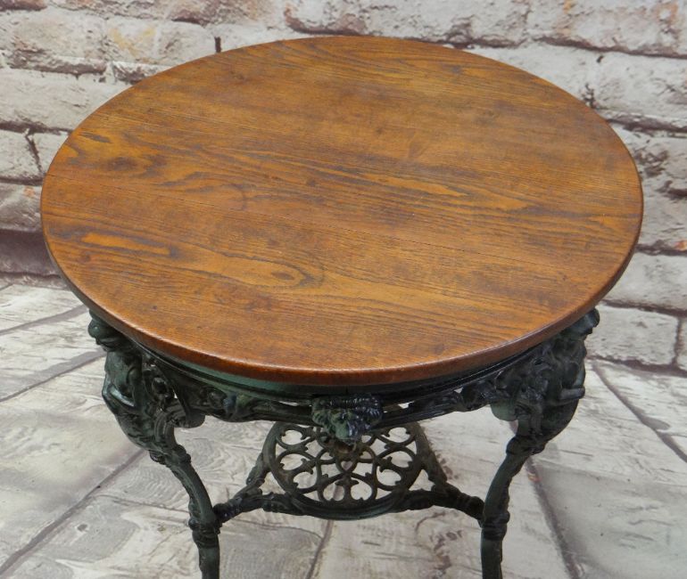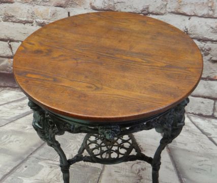 MODERN VICTORIAN-STYLE METAL & STAINED WOOD PUB TABLE, legs pierced and cast with Britannia, llion's paw feet, 63cms diameter