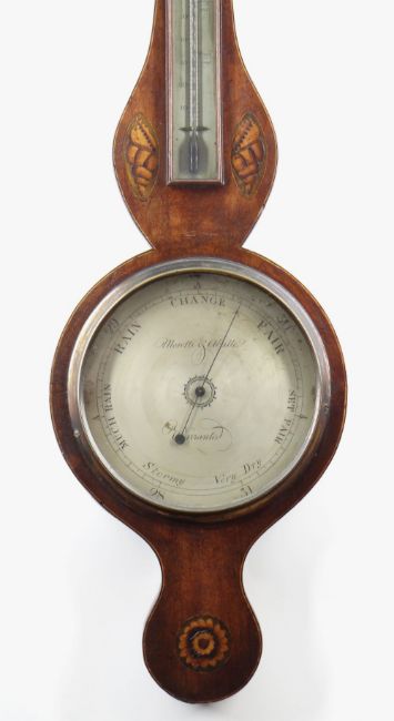19TH CENTURY MAHOGANY & MARQUETRY TWO-GLASS WHEEL BAROMETER, Baretti & Abatte, 94cms h