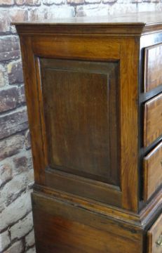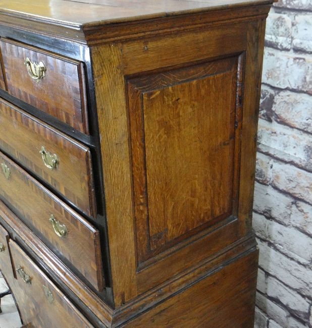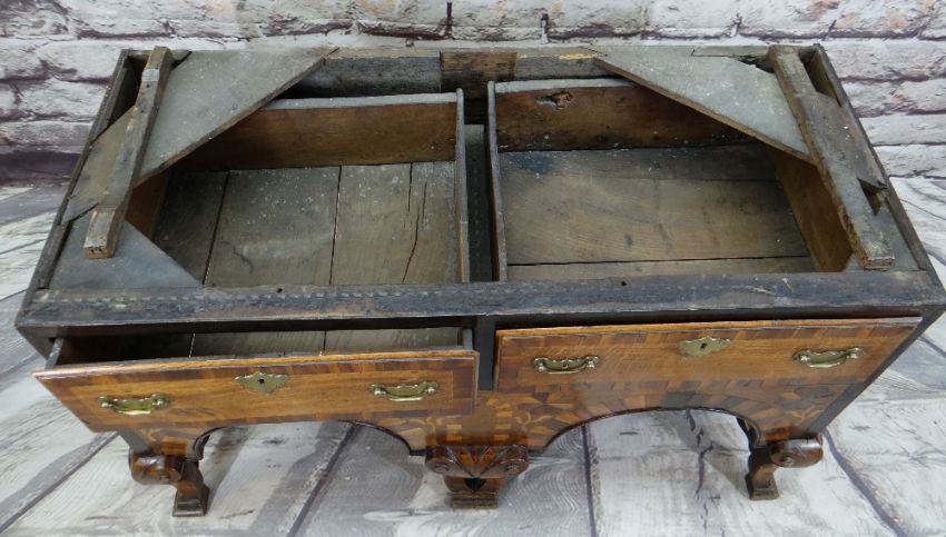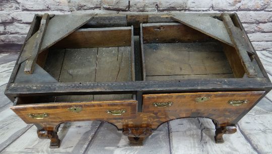 Condition: legs and stretchers later, top boards shrunk, some elements replaced, oak side panels possibly replaced.