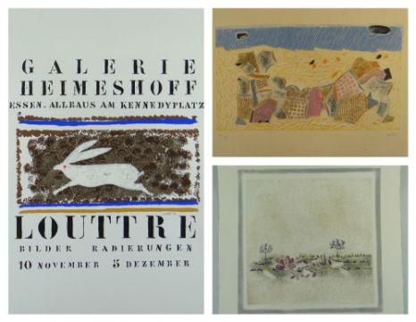 LOUTTRE.B (MARC-ANTOINE BISSIERE) (1926-2012), three prints: (i) limited edition (37/60) relief etching with colour on Arches France - Landscape, signed and numbered in pencil, (PL) 44 x 44cms; (ii) AP (2/6) etching - abstract landscape, signed and numbered in pencil, (PL) 30 x 52.5cms; (iii) screenprint for Galerie Heimeshoff exhibition dated 10 November 5 December, signed in pencil, 56 x 38cms, unframed (3)