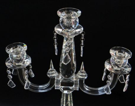 MODERN CUT GLASS THREE-LIGHT CANDELABRUM, faceted drops, 60.5cms h
