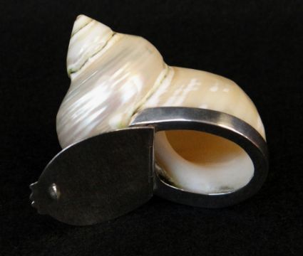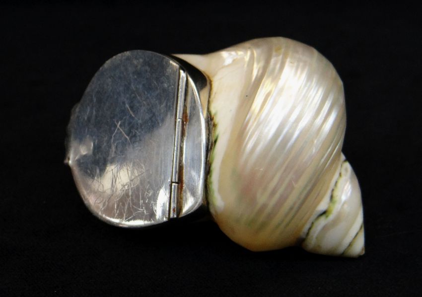 BBC BARGAIN HUNT LOT: MODERN SILVER MOUNTED POLISHED TURBO SHELL 'SNUFF' BOX, stamped 925, 6cms long