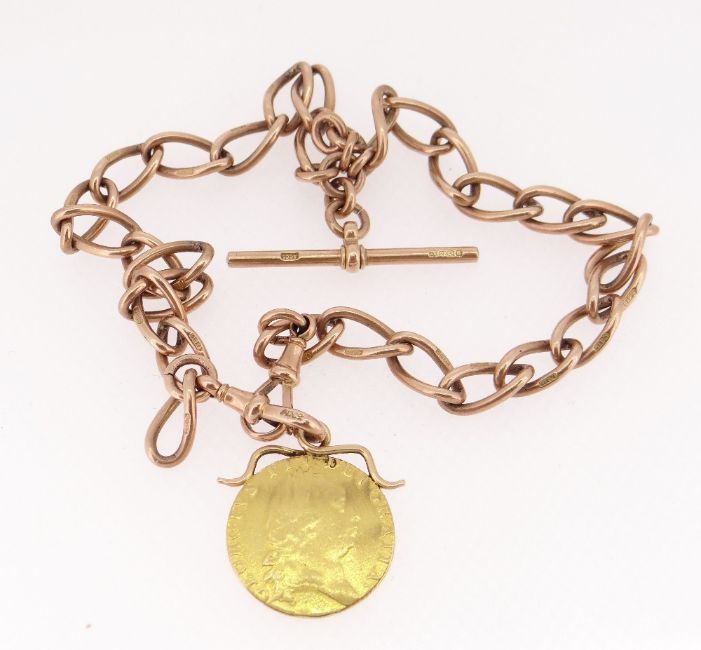 9CT GOLD CURB LINK ALBERT CHAIN, with T-bar, 39.5cms long, with mounted George III 1792 spade guinea, 48.2gms overall