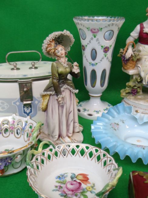 ASSORTED EUROPEAN PORCELAIN AND GLASS, including Judendstiil-style oval stencilled decorated casket, 2 Dresden pieced baskets, similar box and cover, Coronet Ware cruet, Bohemian flashed glass vase, figural group, three other figurines ETC. (11)