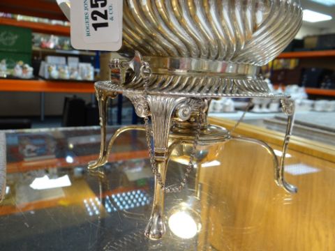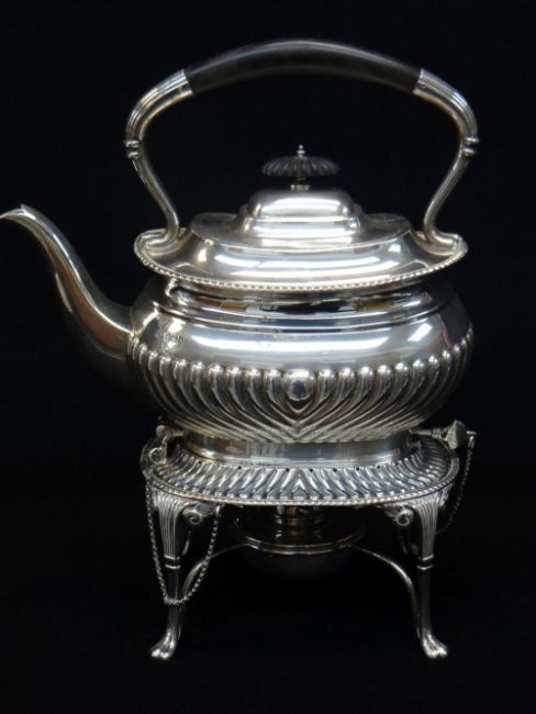 GEORGE V SILVER SPIRIT KETTLE ON STAND, Sheffield 1911 by Harrison Brothers, half fluted oval body with gadrooned rims, reeded and wood over handle, wood knop, reeded and scrolled cabriole legs with paw feet, 29cm high, appr. tot. gross wt. 41ozt