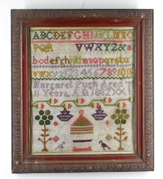 LATE VICTORIAN NEEDLEWORK ALPHABET SAMPLER, by Margaret Pugh aged 11, dated 1882, 34 x 30cms.