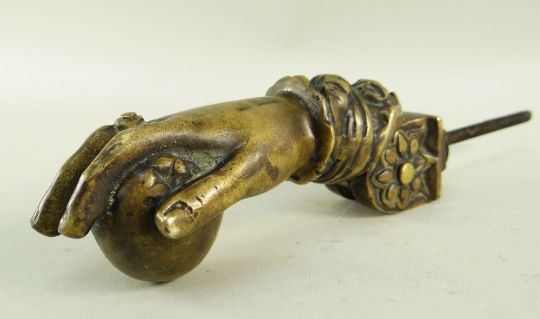 BBC BARGAIN HUNT LOT: VICTORIAN BRASS HAND DOOR KNOCKER, the ringed hand with ribbon cuff and holding a fruit, 15cms long