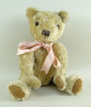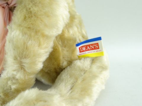 BBC BARGAIN HUNT LOT: DEAN'S GOLDEN PLUSH TEDDY BEAR, c. 1980s, stitched nose, wearing pink ribbon, red/yellow/blue Pontypool printed label, 34cms high
