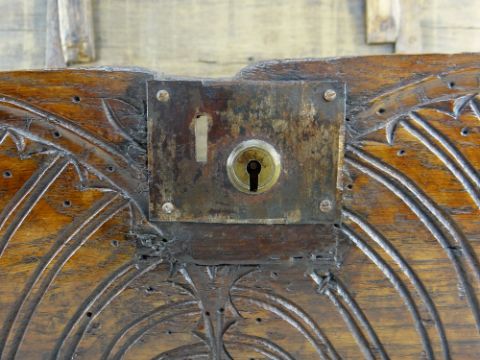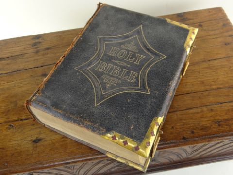 Condition: Box - replaced lock and hinges, top cracked and braced; Bible - top cover loose, generally a little worn