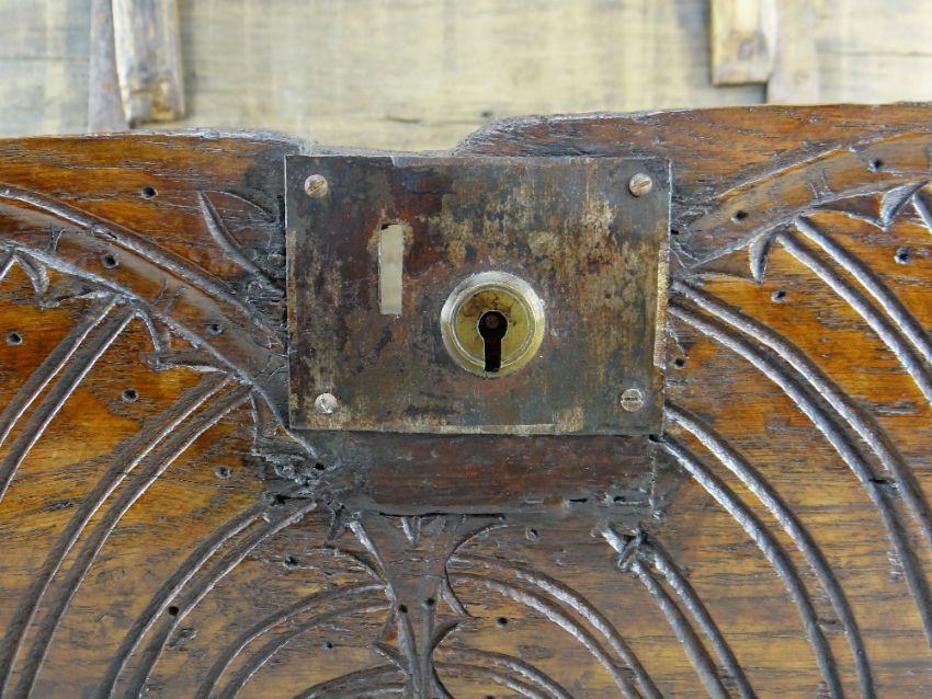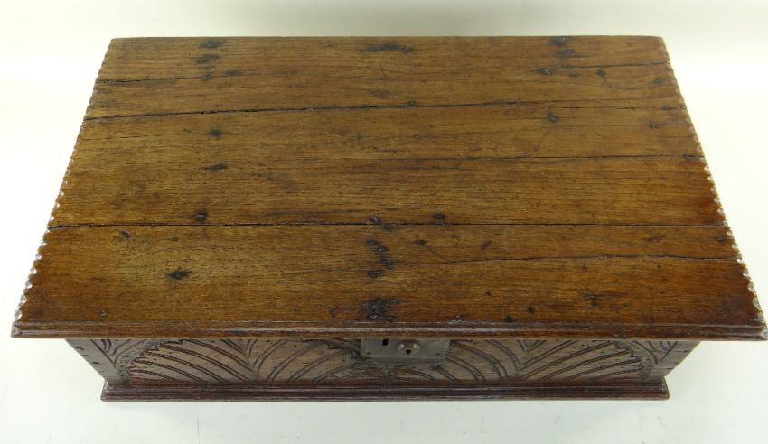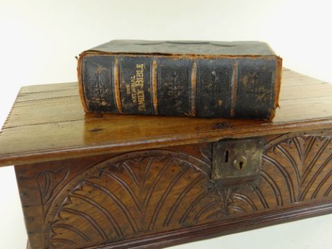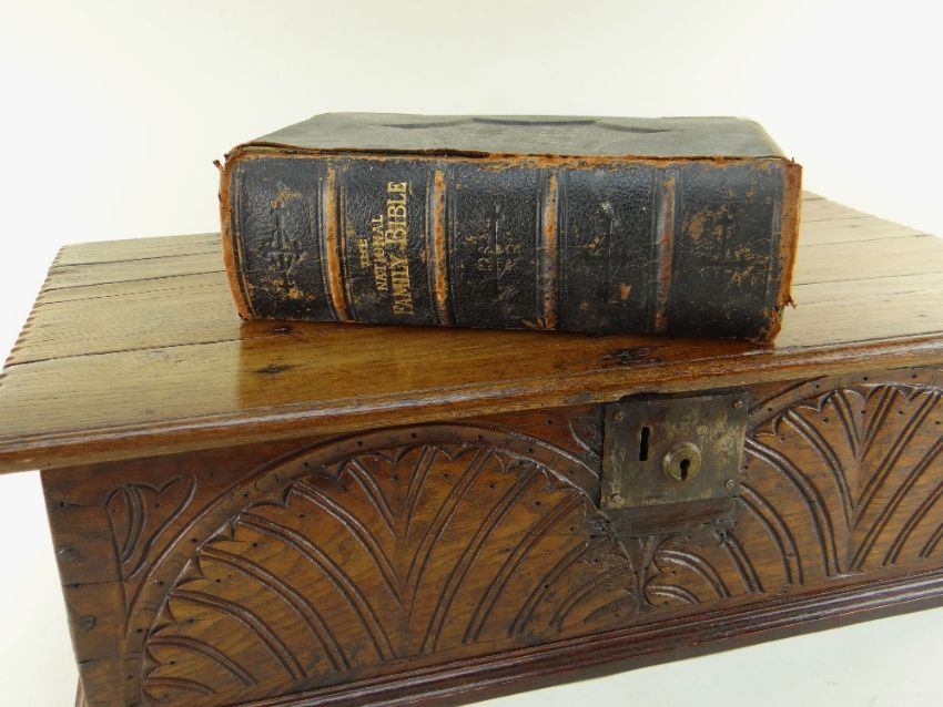 BBC BARGAIN HUNT LOT: 18TH CENTURY BOARDED OAK BIBLE BOX AND VICTORIAN BIBLE, the box with chip carved edges to the hinged lid, front panel with lunette carving, 71w x 42d x 20hcms; National Family Bible edited by Rev. John Eadie, and contining lithographed plates, gilt metal bound brackets, tooled gilt spine and covers (2)