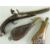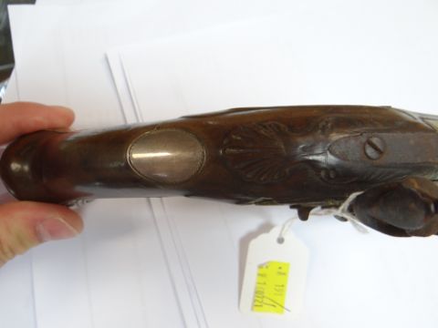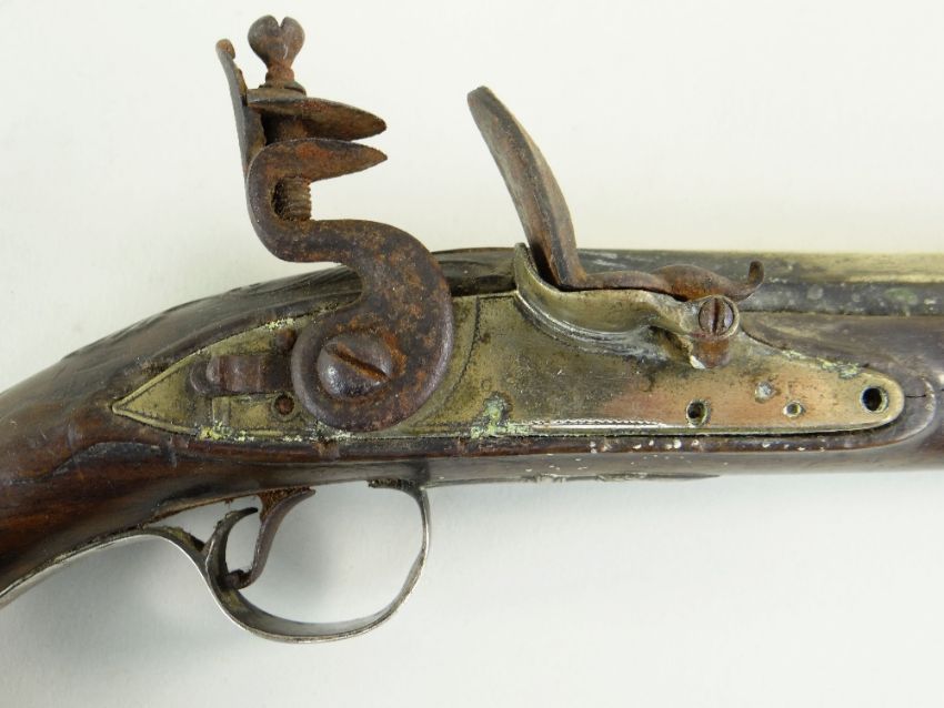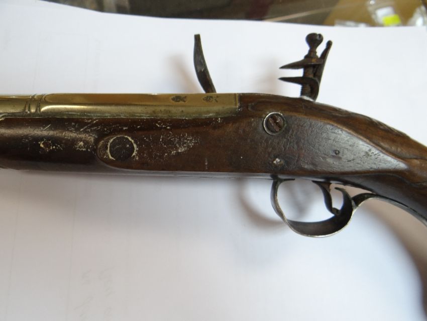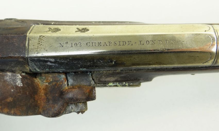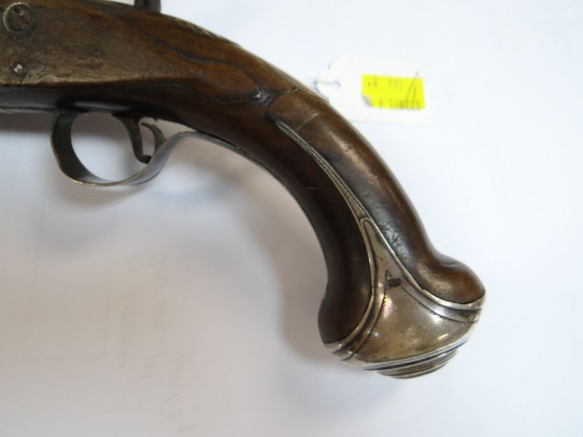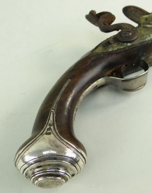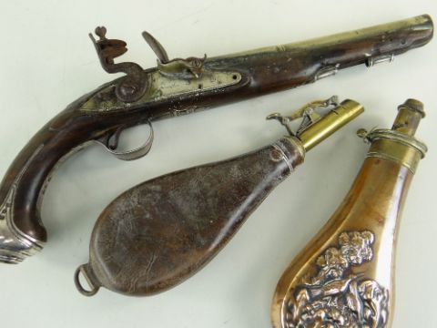 18TH CENTURY SILVER MOUNTED BRASS BARRELLED FLINTLOCK PISTOL, retailed by R. Clarke, with two stage barrel engraved '102 Cheapside London' on the top of the octagonal breech, signed lock, with safety, rainproof pan, silver butt cap and trigger guard with acorn finial hallmarked for Birmingham 1777, two Birmingham proof marks, barrel 20cms; together with 2 shot flasks in embossed copper and in leather (3)Condition: ramrod missing, frizzen spring missing, lock plate loose and missing screws. leather flask spring broken. Copper flask worn