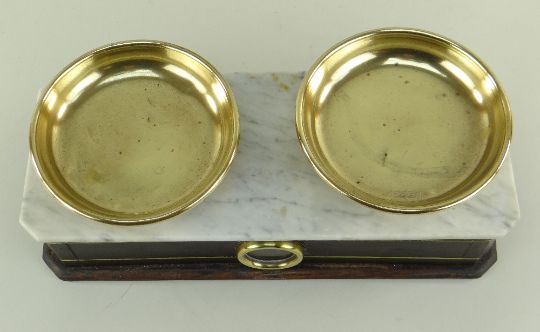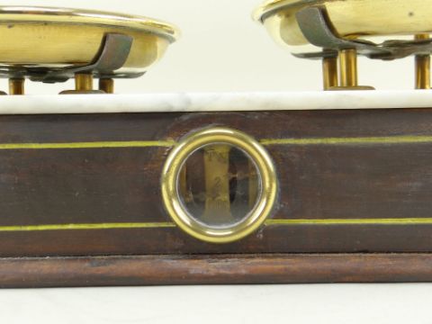 VINTAGE FRENCH SHOP SCALES, with brass dishes, marble top and brass framed viewing window, 36cmS wide