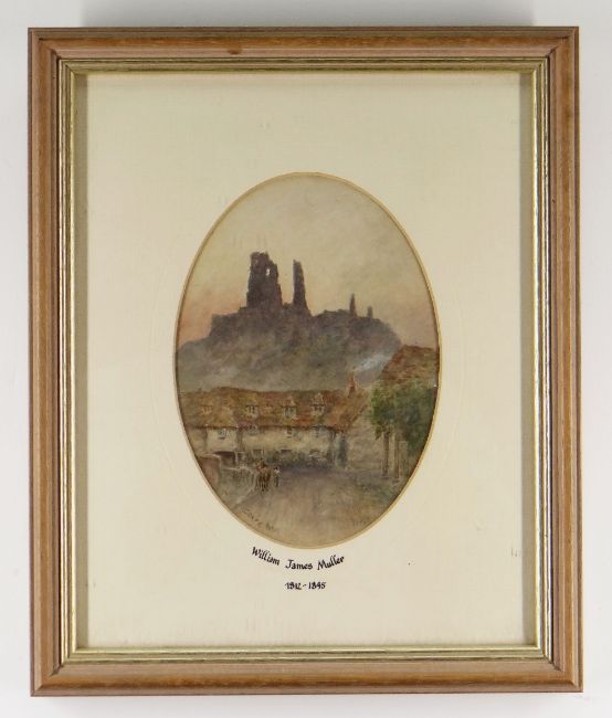 CIRCLE OF WILLIAM JAMES MULLER watercolours - entitled Corfe, Warwick and Shrewsbury, two bear initials/signatures, named on the mounts, largest 23 x 30cms (3)