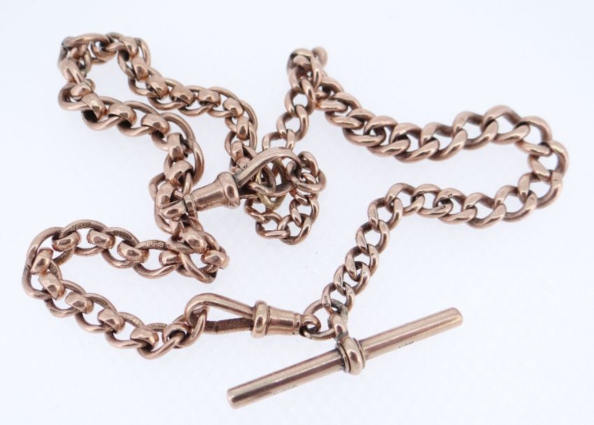 9CT GOLD MATCHED WATCH CHAIN, having T-bar, assorted curb links, 33.8gms