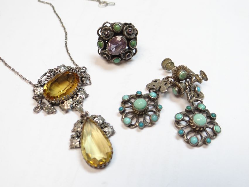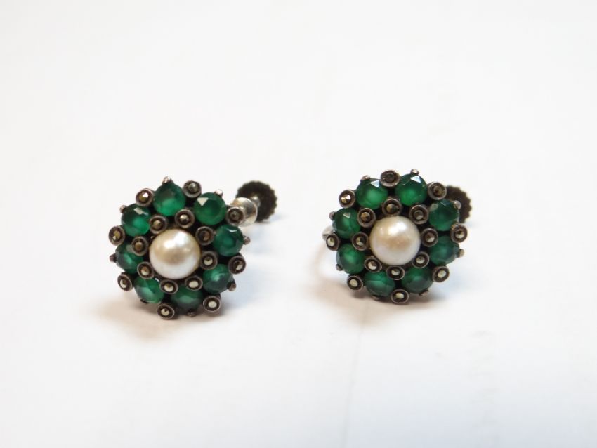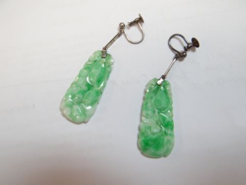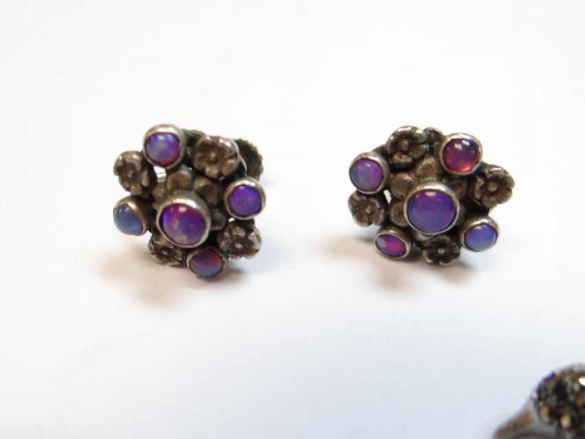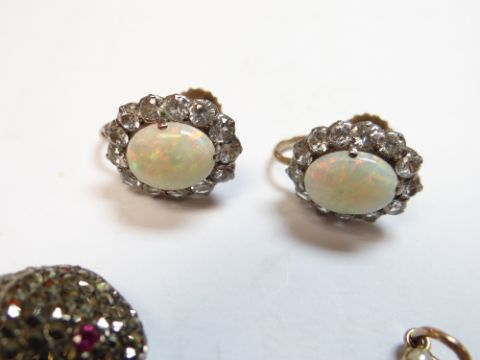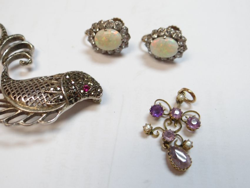 ASSORTED JEWELLERY comprising enamel and marcasite bar brooches, gem set earrings, pair of jadeite earrings, pendant necklace, opal earrings, necklace ETCThe jadeite earrings are 35 x 15mm in size.
