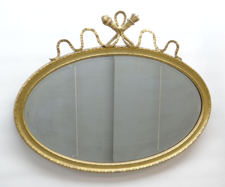 VICTORIAN OVAL MIRROR, gilt gesso frame with ribbon and trophy cresting, 74 x 94cms