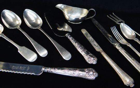 ASSORTED SILVER comprising pair of George III silver table spoons, 21.5cms long, London 1816, William Bateman I, another similar Victorian silver table spoon, 22cms long, London 1848, Robert Wallis, silver engraved three piece cutlery Christening set, small silver sauce boat, various silver handled stainless steel cutlery ETC