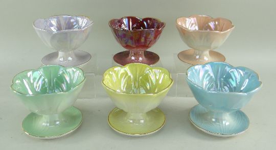 BBC BARGAIN HUNT LOT: SET OF SIX BESWICK LUSTRE 'HARLEQUIN' SUNDAE DISHES, circular and leaf-moulded, printed marks, 11cms diam. (6)