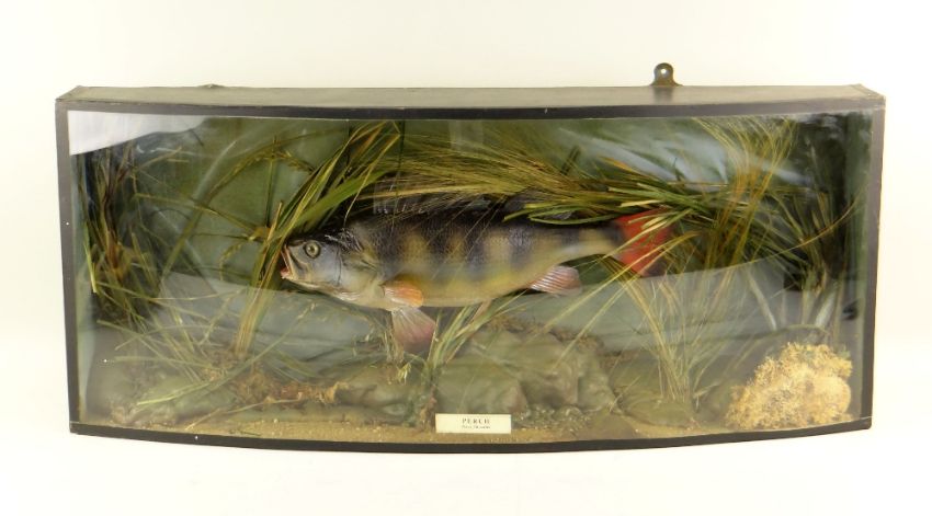 MODERN REPRODUCTION CASED TROPHY FISH , 'Perch' mounted in antique-style bowfront case, 33 x 80cms