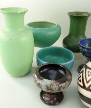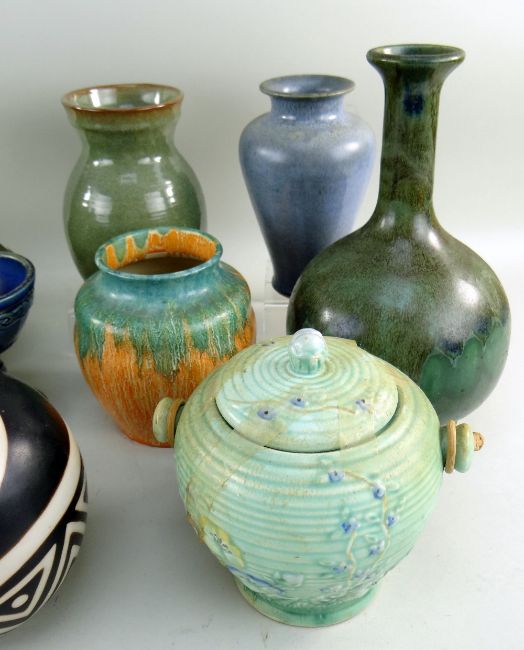 ASSORTED 20TH CENTURY CERAMICS including Bratby mottled green bowl and a 1930s green floral moulded biscuit barrel etc.(12)