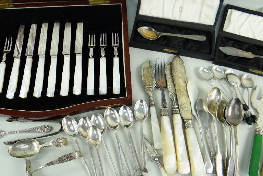 ASSORTED SILVER & PLATED FLATWARE, including set of mother of pearl handled fruit knives and forks in silk lined 'Cross Brothers' mahogany case, toasting forks, pair boxed teaspoon and butter knife, various coffee spoons, mother of pearl handled knife and fork, ETC. tot. appr. gross wt. 18.5 ozt