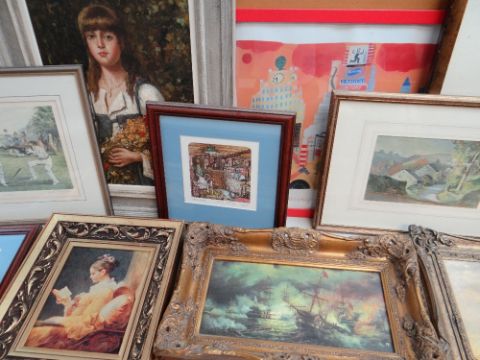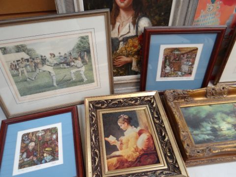ASSORTED DECORATIVE PRINTS, including pair of Limited Edition colour prints by Colin Carr, Limited Edition cricketing print by David Hinch Lille, oil painting of a girl with bouquet of red flowers, and flower painting on silk of Hibiscus ETC (21)