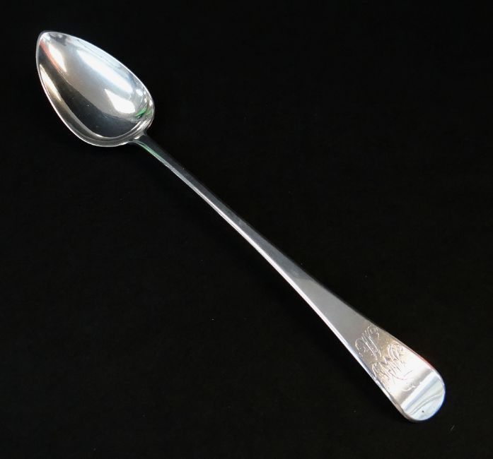 BBC BARGAIN HUNT LOT: GEORGE III SILVER BASTING OR STUFFING SPOON, London 1803 by Thomas Wallis II, Old English pattern, handle engraved with monogram, 30cms long, appr. wt. 3.5ozt.