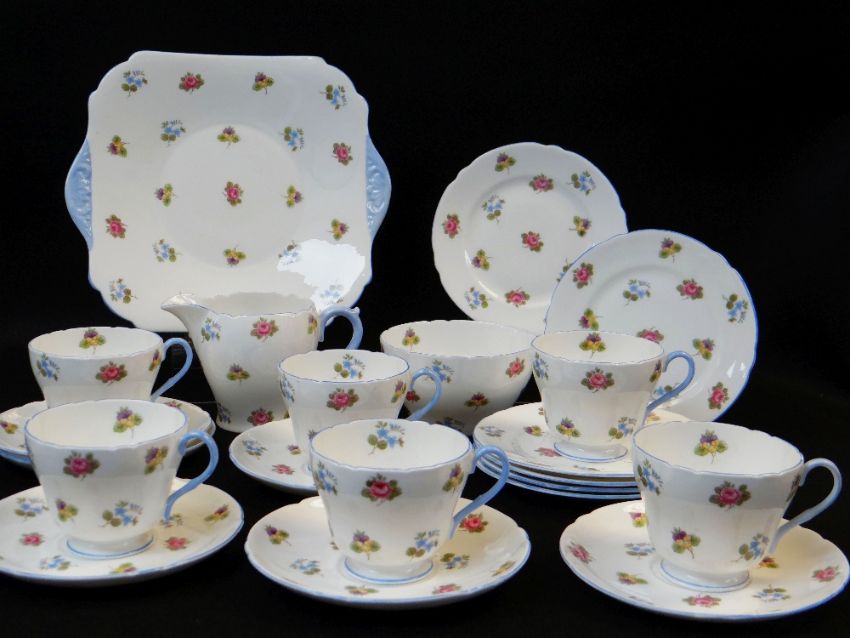 SHELLEY FINE BONE CHINA TEASET FOR SIX, decorated with roses, pansies and forget-me-knots within blue borders, pattern number 13424, comprising six each of tea cups, saucers, and side plates, and a cream jug, sugar bowl and sandwich plate (21)