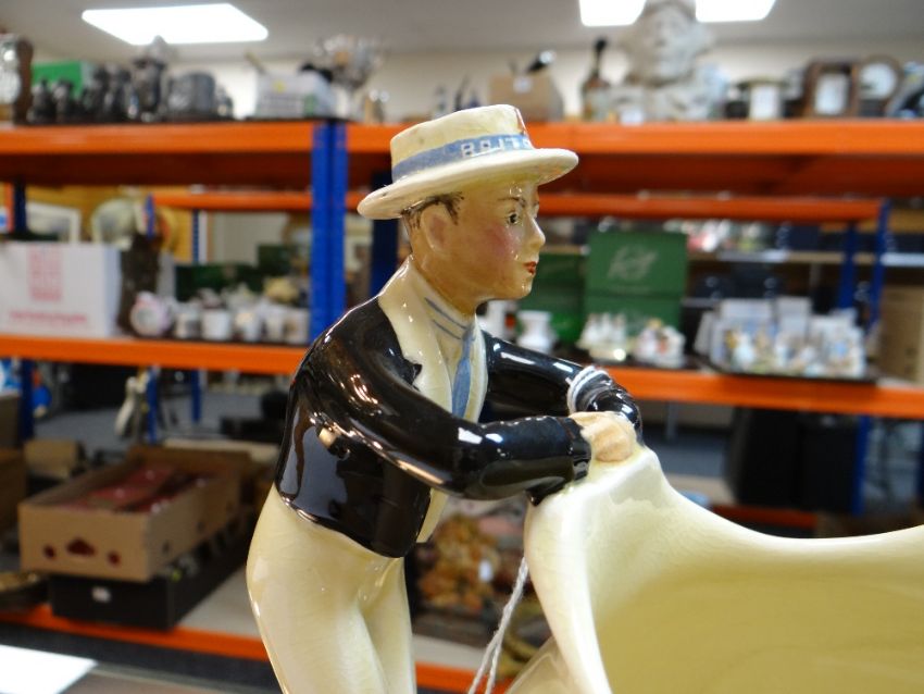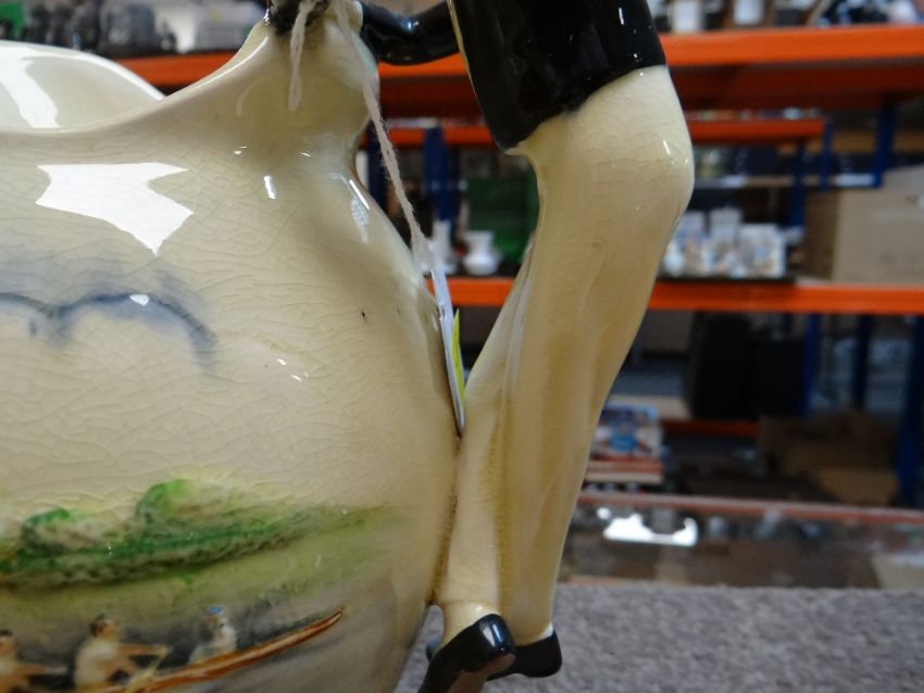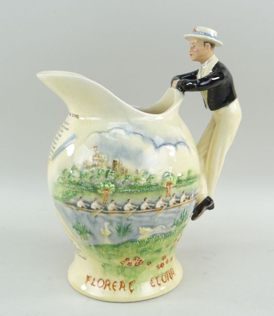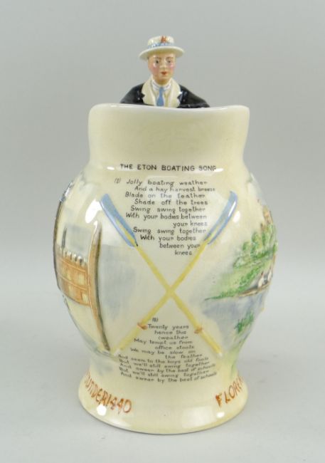 RARE CROWN DEVON 'ETON BOATING SONG' MUSICAL JUG, moulded with rowing scenes, view of the school building and song verses, 24cm highCondition: good, musical movement working as normal