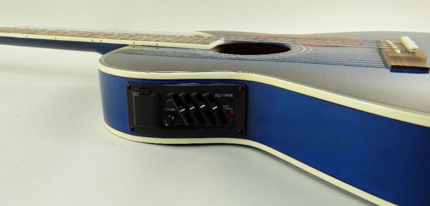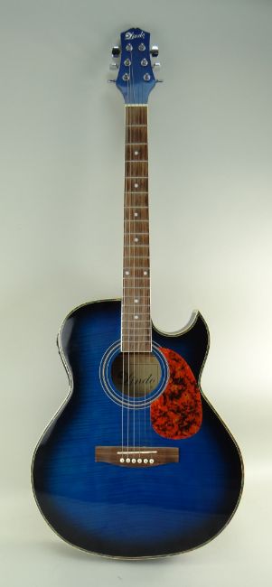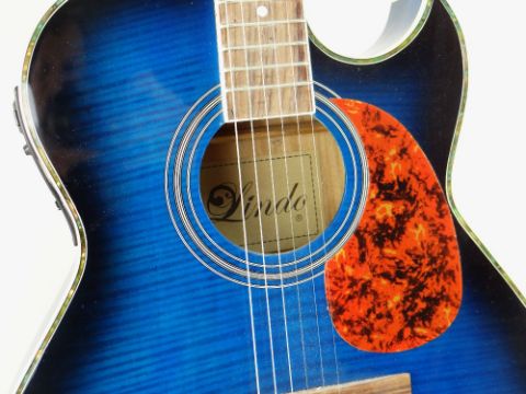LINDO SLIM ELECTRO-ACOUSTIC GUITAR, blue sunburst finish with simulated mother of pearl border, fretboard with plastic inserts, 104cms long