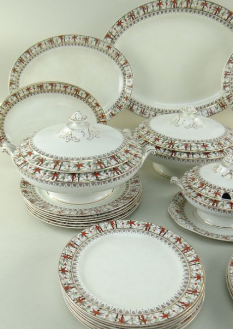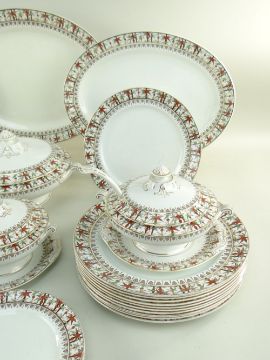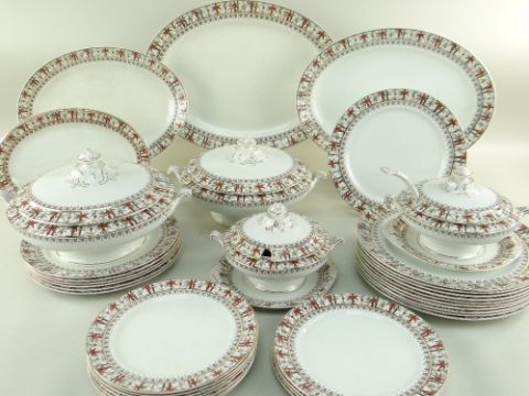 LATE VICTORIAN POTTERY 'MAYFAIR' PART DINNER SERVICE, brown-printed and enamelled with bamboo border design, comprising vegetable and sauce tureens, ladle, graduated meat dishes, 10 dinner, 7 salad and 11 side plates