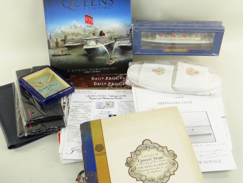 COLLECTION OF CUNARD and RMS QUEEN MARY MEMORABILIA, including rare 1934 Launch of The Queen Mary souvenir programme, vintage Queen Mary popular puzzle by R Journet & Co., modern boxed model of Queen Mary, 'Queen Of The Mersey - a Special Homecoming' book by Tony Story, celebrating 175 years of Cunard, related special voyage memorabilia including Daily Programmes for July 2013. ETC