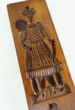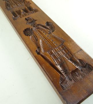 BBC BARGAIN HUNT LOT: ANTIQUE CONTINENTAL BEECH GINGERBREAD MOULD, probably Dutch, double sided and intaglio-carved with two figures in costume to each side,. 63 x 13cms