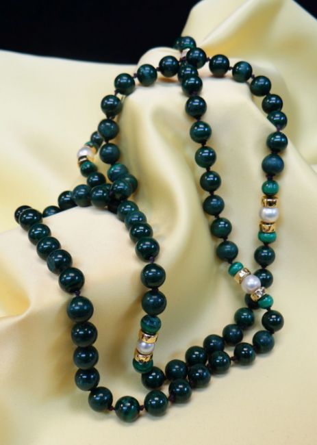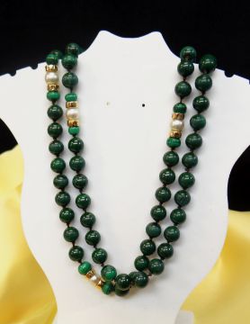 Condition: a few chips to malachite beads, some dents to yellow metal buffers