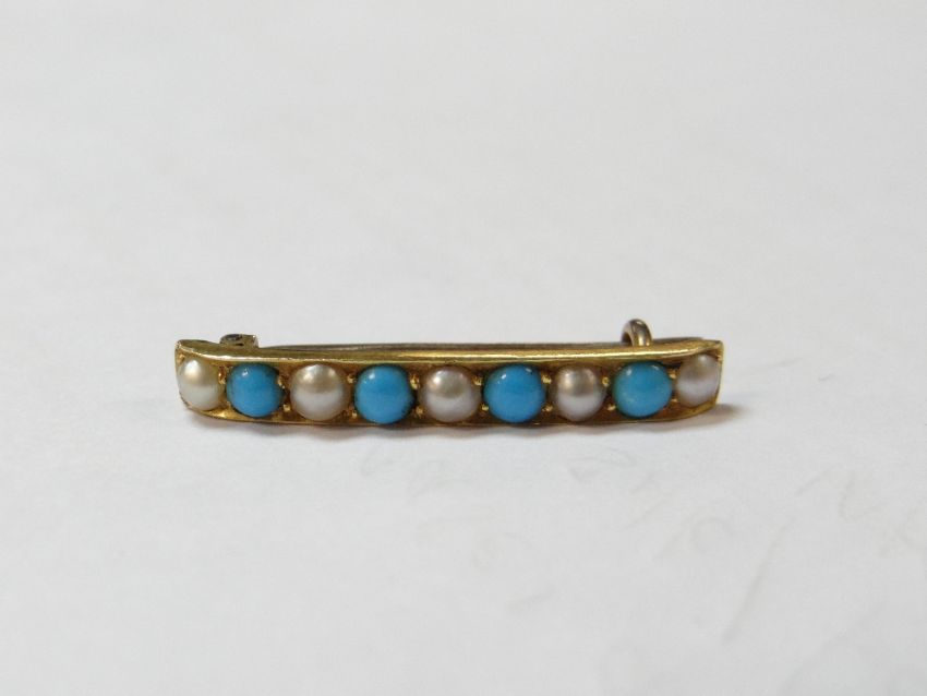 ASSORTED JEWELLERY comprising 9ct gold turquoise and seed pearl bar brooch, yellow metal heart shaped seed pearl locket, pair of yellow metal floral pearl earrings, gold heart shaped diamond and ruby charm, turquoise set stick pin and bar brooch (7)pearl heart, 4 grams, no damage, open back, no damage, 15mmx20mmRuby heart 1.4grams, dented.Turquoise bar brooch, 2 grams, no damage, stones look dull.Pearl earrings, 3.3 grams, look good no damage.Pearl and turquoise bar brooch 2.3grams, no damage.Turquoise pin, 4.7grams, no damage.